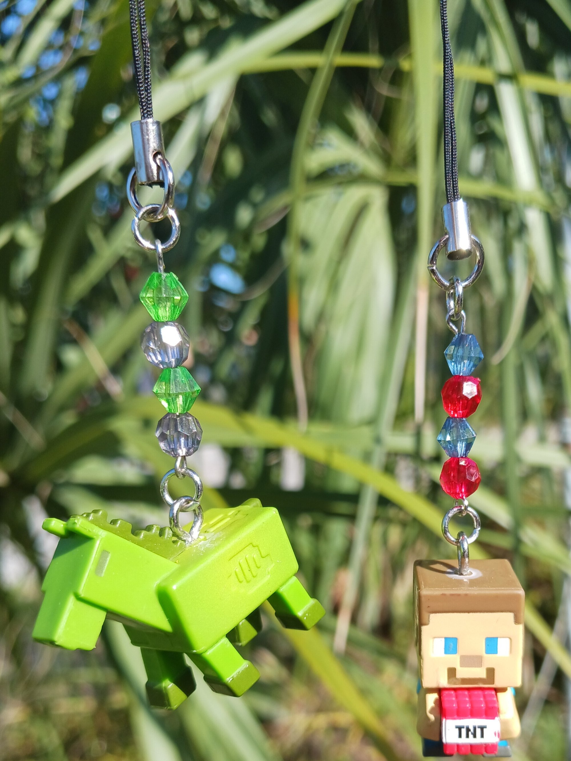 Add some pixelated fun to your phone, bag, or keychain with these Minecraft-themed phone charms! Each charm features a used Minecraft figure, paired with coordinating beads and a phone lanyard strap, measuring approximately 5 inches in total length.